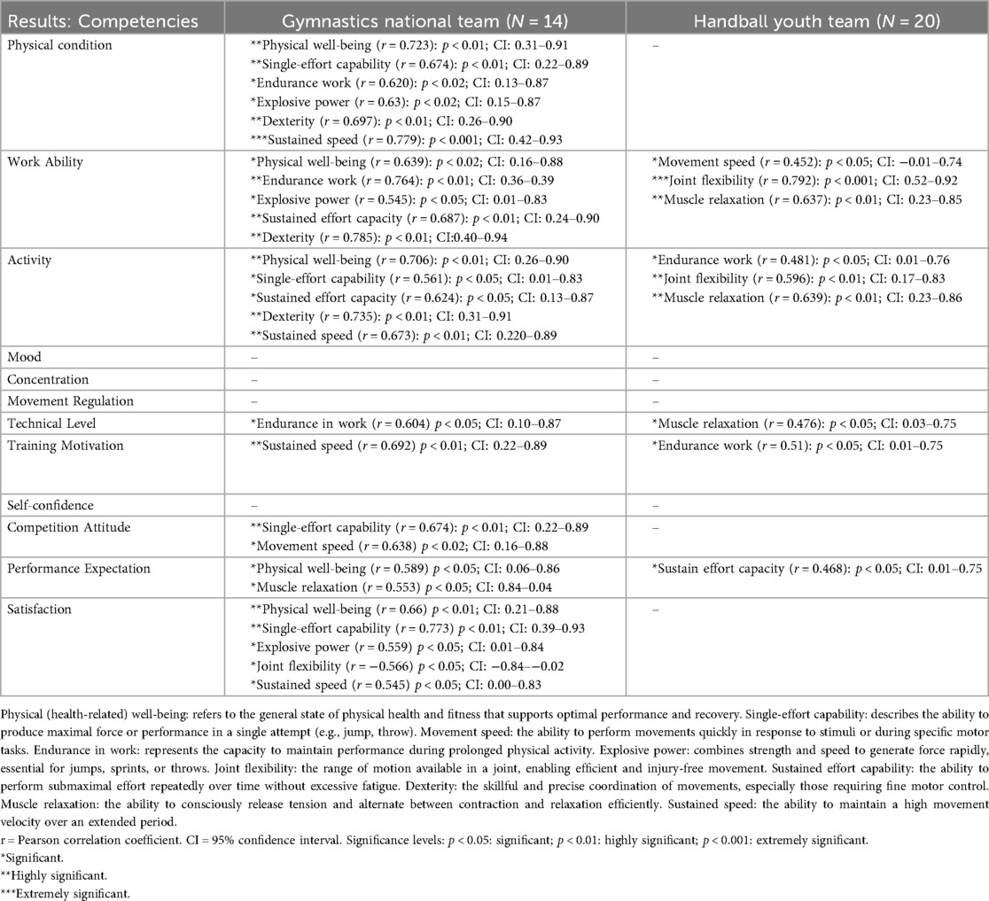 The divergent correlations observed in the two samples clearly illustrate these differences. Among artistic gymnasts, the strongest correlations with physical abilities were found for the competencies of endurance, perseverance, activity, performance expectation, and satisfaction. These factors are crucial in artistic gymnastics, given the sport's emphasis on individual, static, and precisely executed movement sequences. During routines, continuous activity and physical presence are indispensable for successful performance (29, 41). Furthermore, for gymnasts, self-imposed performance expectations often serve as powerful internal motivation, ultimately reflected in a sense of satisfaction.