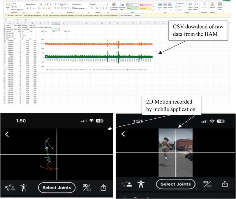 In groups, and when asked by the teacher, students collaborated by using a markerless mobile application (SPLYZA Motion, Hamamatsu City, Shizuoka, Japan) to record each other's countermovement and vertical jump during the TGA - that is, one student performed the countermovement jump and vertical jump while wearing a HAM while another recorded the motion via their own smart phone device. Raw acceleration data from the SPLYZA Motion MMC was recorded at a sampling rate of 60 Hz. At the end of the practical lessons, raw data from both systems were downloaded and processed by the students in CSV format and saved and exported to Microsoft Excel (Microsoft Corporation, Redmond, Washington, USA, Version 16). The data was then deconstructed into three second epochs by the students to consolidate the timestamp between the two systems. This data was used by the students in the theoretical classes whereby they analysed, interpreted and applied graphical, visual and physical representations of the jumps by looking at both HAM and SPLYZA data sets (Figure 2). Data from the HAM and SPLYZA were then superimposed on a single graphical representation to produce an overlay.