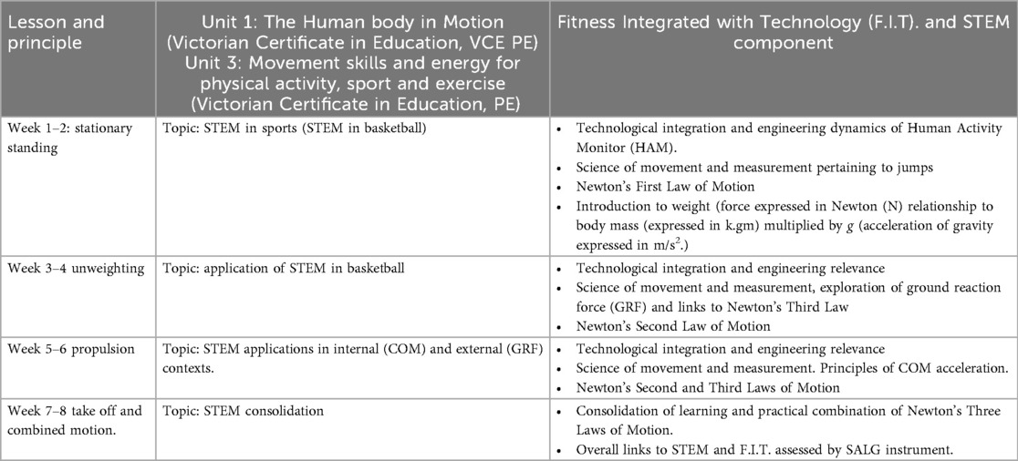 From May 2024 to July 2024 the teacher attended five online professional development workshops, each lasting for approximately 60 min that were facilitated by the researchers, in biomechanical principles, game-based pedagogy and interdisciplinary approaches to teaching. The workshops were designed to provide the teacher with background knowledge in subject specific content and curriculum coherence that would allow integrative theoretical and practical lessons that met learning intentions. The teacher took notes throughout the workshops. In July 2024 the teacher presented a scope and sequence document (Supplementary Appendix A) to the researchers that outlined how lessons would be integrated and taught that aligned with the VCE PE curriculum and that were pedagogically adaptive to the subject topic.