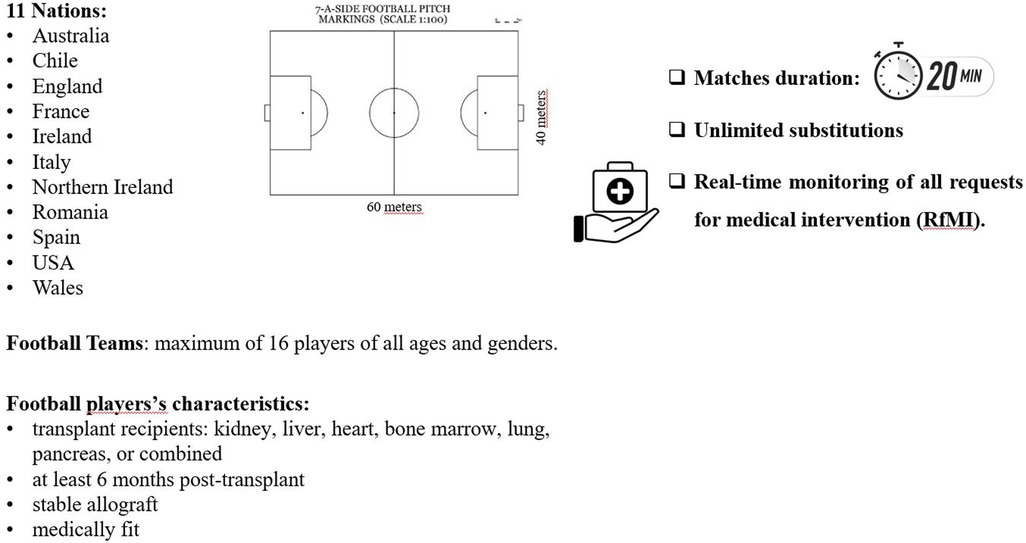 Two standard FIFA pitches measuring 60 × 40 m, with 3 m goals, were utilized. Teams consisted of a maximum of 16 players of all ages and genders. Matches lasted 20 min with unlimited substitutions. Two sports physicians were always present to provide medical assistance and real-time monitoring of all requests for medical intervention (RfMI). Following the Injury Consensus Group of FIFA's Centre for Medical Evaluation and Research (21) detailed data were collected, together with the type of transplant, on: