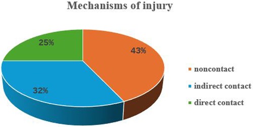 RfMIs were 28 (16% of participants) involving 13 liver (52%), 9 kidney (9%), 3 heart (21%), 2 bone-marrow (11%) and one kidney-pancreas (14%) recipients. Among them, 26 were males and two females. They were aged 36.0 ± 11.1 years, playing as defenders (10), strikers (8), midfielders (6), and goalkeepers (4). Mechanisms of injury were by noncontact (12), indirect contact (9) and direct contact (7) (Figure 2). Injuries were classified as: acute (23; 82%), acute- on-chronic (4; 12%) and chronic (1; 4%). Injury types were shown in Table 2. The types of injuries in relation to the role played on the field are shown in Table 3, and the locations of injuries were shown in Table 4.