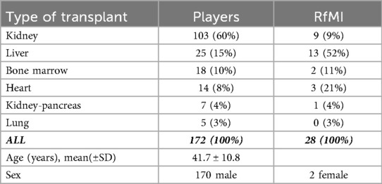 Notably, liver recipients accounted for over half of the injuries, despite representing a smaller proportion of the total population. However, it is important to note that most of the RfMI came from players who played as defenders, and among these, most had undergone liver transplants (10 out of 13).
