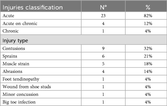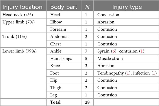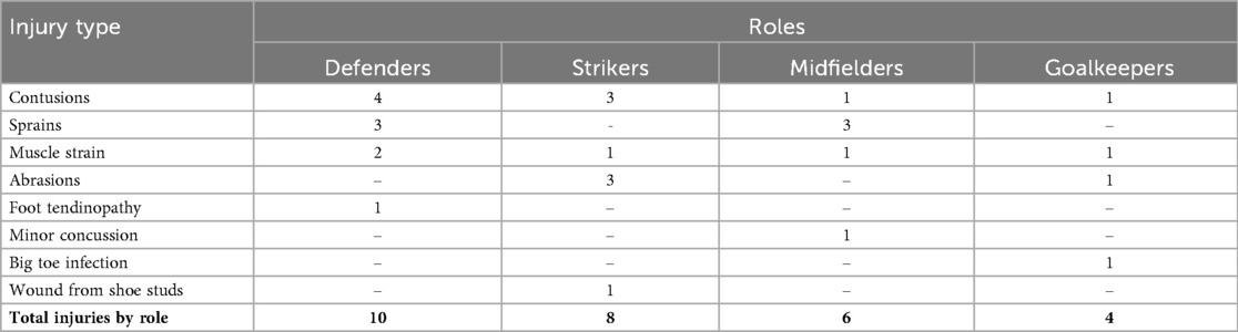 Injury patterns varied somewhat by playing position. Defenders and strikers suffered mainly contusions and sprains, while midfielders had a mix of sprains and minor concussions. Goalkeepers experienced a wider variety of injuries, including infection and abrasions, possibly related to their unique role and movements on the field. These findings underscore the importance of position-specific preventive strategies and conditioning programs tailored to the physical demands and injury risks of each role, which need further investigation.