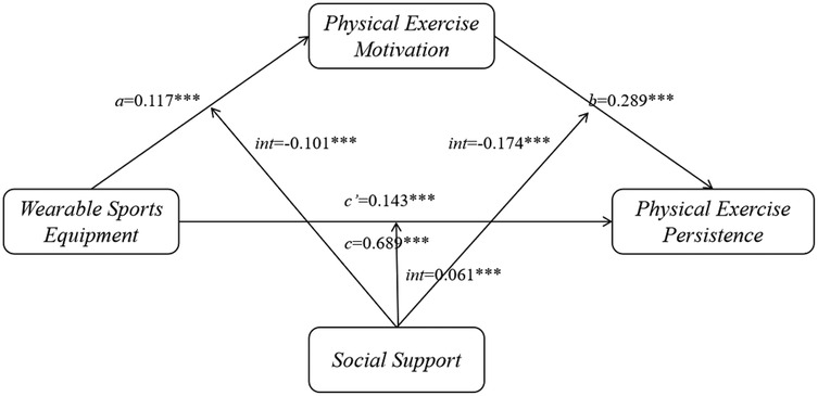 As shown in Table 2, the results of the moderated mediation model indicated that wearable sports equipment usage was positively related to both physical exercise persistence (β = 0.143, p < 0.001) and exercise motivation (β = 0.117, p < 0.001). Social support was not only directly and positively related to physical exercise persistence (β = 0.449, p < 0.001) and exercise motivation (β = 0.781, p < 0.001), but also significantly moderated the relation between wearable sports equipment usage and the two outcome variables. The interaction terms were statistically significant (β = 0.061 and −0.101, respectively, both p < 0.001). Additionally, exercise motivation showed a significant positive relation with physical exercise persistence (β = 0.289, p < 0.001), and this relation was negatively moderated by social support (β = −0.174, p < 0.001).