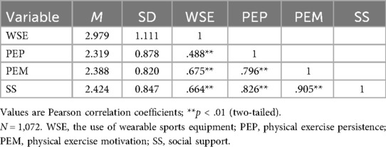 As shown in Table 1, the descriptive statistics and correlation results for each variable are as follows: the mean score for wearable sports equipment usage was 2.979 (SD = 1.111), for physical exercise persistence was 2.319 (SD = 0.878), for exercise motivation was 2.388 (SD = 0.820), and for social support was 2.424 (SD = 0.847).