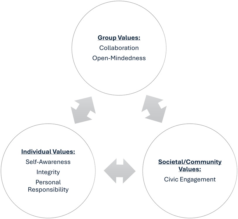 The outcome variables for this study are the Socially Responsible Leadership Scale (SRLS) (29, 30) and the Leader Self-Efficacy (LSE) scale (36, 37). Considered a form of gauging leadership capacity, the SRLS measures leadership as conceptualized by the Social Change Model of Leadership Development (SCM) (29, 30). Although leadership can be conceptualized in many ways, the SRLS aligns well with modern conceptions of leadership (27), reflects the democratic aims of higher education (38), and is most commonly used in higher education in the United States (28). The SRLS consists of 34 items comprising 6 subscales, reflecting the SCM values of self-awareness, personal responsibility, integrity, collaboration, open-mindedness, and civic engagement (Figure 1) (39). [Common purpose is included in the SCM but is excluded from the SRLS because it is not sufficiently divergent from collaboration (39)]. The response options for the SRLS items range from 1 (strongly disagree) to 5 (strongly agree).
