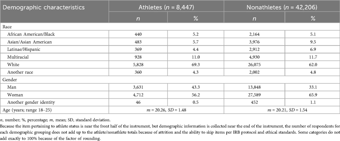 The MSL was administered online to a random sample of undergraduate students at institutions across the United States. Higher education institutions voluntarily enrolled in the study and provided a random sample of 4,000 students or a census sample if their enrollment amounted to fewer than 4,000 students. Participants provided written informed consent to participate in this IRB-approved study (IRB Project Number 2,328 from Loyola University Chicago). The MSL was administered to 256,289 undergraduate students between January and May 2018 with a 29% response rate. The sample is representative of higher education institutions based on size, affiliation, and classification. In the present study, age was restricted to 18–25 years, given that most college athletes fall in this age range. The final analytic sample size after applying the age restriction was 50,563 participants (see Results and Table 1 for details).