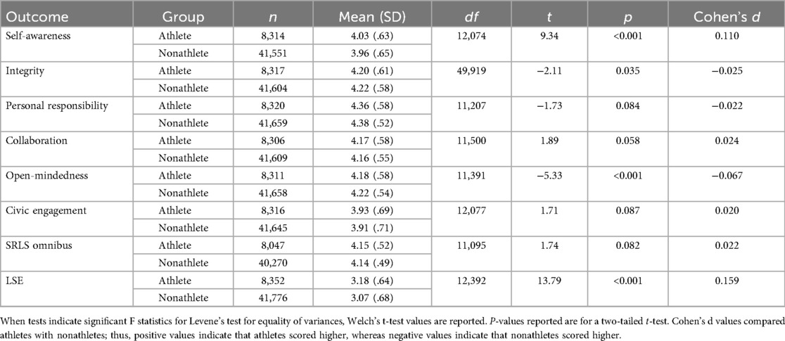 There were mixed results for the parameters of relative leadership capacity and self-efficacy for athletes compared with those for nonathletes (Table 2). Athletes reported higher levels of self-awareness and LSE compared with nonathletes. In contrast, athletes had lower levels of integrity and open-mindedness compared with nonathletes. There were no statistically significant differences in terms of personal responsibility, collaboration, civic engagement, and the overall SRLS (omnibus). All Cohen's d effect sizes were trivial (i.e., less than 0.2) (45).
