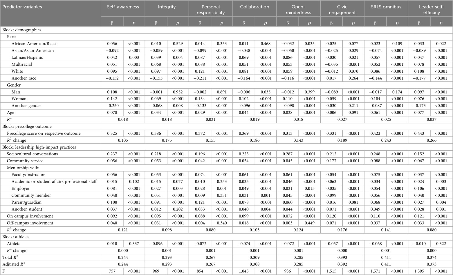 Table 4. Hierarchical multiple linear regression models including demographics, precollege outcome score, leadership high-impact practices, and athlete status. Note the addition of leadership high-impact practices to this model.