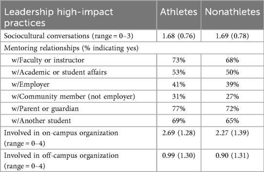 Although athlete status alone had a minimal impact on leadership outcomes, particularly compared with the leadership high-impact practices block, which explained 8.0% to 17.6% of the variance in outcomes (Table 4), athletes reported more frequent participation in leadership high-impact practices, including mentoring relationships and involvement in organizations (Table 5). Athletes may experience sociocultural conversations through informal conversation with teammates who are different from them, community service as their team engages in volunteer or other service experiences, and mentorship through coaches, healthcare providers, and academic advisors. These practices may explain some of the benefits that sports provide regarding leadership development; however, athletes follow leadership high-impact practices beyond sports, and the effects associated with high-impact practices through sports are relatively small. Given that collegiate athletes have highly structured and demanding schedules, typically including around 20 h of training per week plus additional team responsibilities (e.g., film, travel, meetings, study halls, or community service), they may benefit from more intentional integration of leadership high-impact practices into athletic operations. Athletes may also develop important skills such as work ethic, discipline, and time management that translate well into their professional careers (24), lead to professional success, and are reflected in other conceptualizations of leadership.