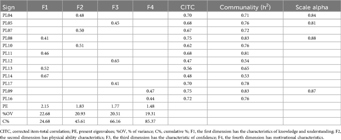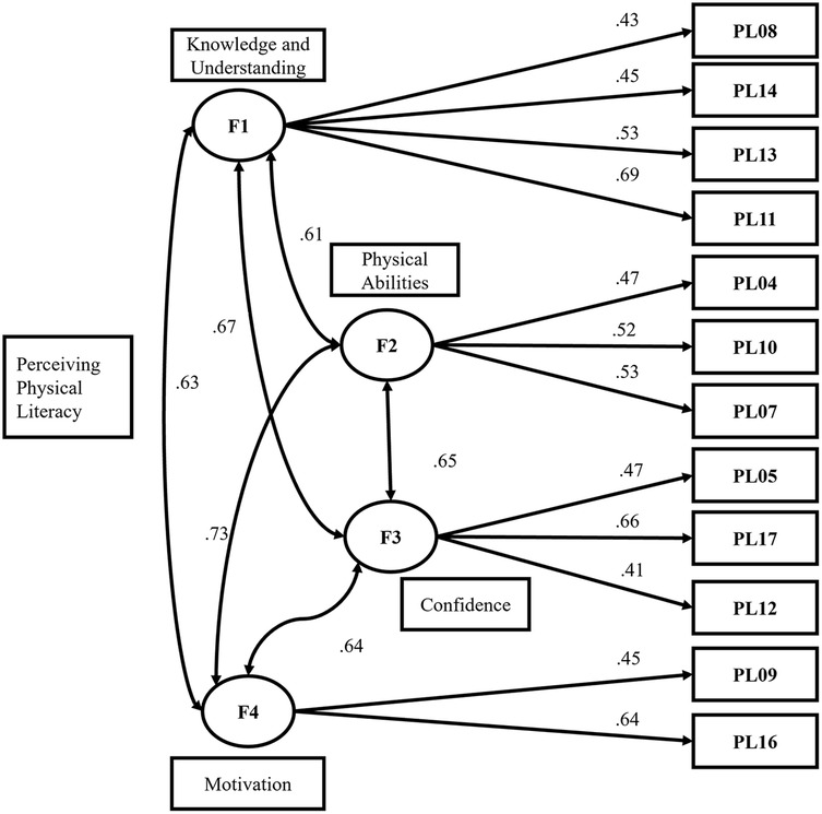 The structural model of PPLI for faculty members (non-physical education teachers) (Figure 1) comprises: The first dimension (F1, Knowledge and Understanding), including items 8, 11, 13, and 14, with factor loadings ranging from 0.43 to 0.69 (>0.32); The second dimension (F2, Physical Ability) included items 4, 7, and 10, with factor loadings ranging from 0.47 to 0.53 (>0.32); The third dimension (F3, Confidence) included items 5, 12, and 17, with factor loadings ranging from 0.41 to 0.66 (>0.32); The fourth dimension (F4, Motivation), comprising items 9 and 16, with factor loadings ranging from 0.45 to 0.64 (>0.32) (50).