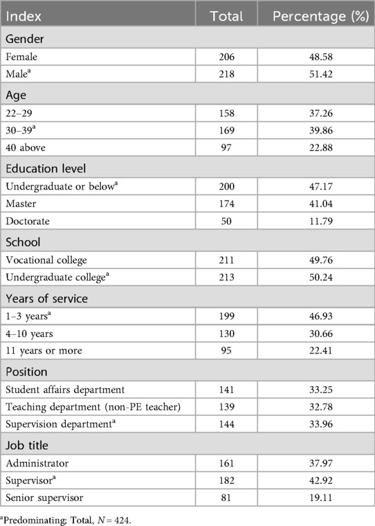 (1) Gender: 218 males (51.42%), and 206 females (48.58%), with fewer females than males. (2) Age: 22–29 years old 158 (37.26%), 30–39 years old 169 (39.86%), 40 years old and above 97 (22.88%), with the 30–39 age group being the most numerous. (3) Educational background: 200 respondents (47.17%) had a bachelor's degree or below, 174 respondents (41.04%) had a master's degree, and 50 respondents (11.79%) had a doctorate degree. The majority of respondents had a bachelor's degree, which is consistent with the educational situation in Chinese universities. (4) Schools: 49.76% of respondents attended vocational colleges (211), and 50.24% attended undergraduate colleges (213); the number of respondents from both types of schools was roughly equal. (5) Years of service: 1–3 years 199 accounting for 46.93%, 4–10 years 130 accounting for 30.66%, 11 years and above 95 accounting for 22.41%, with 1–3 years being the majority (consistent with educational background). (6) Departments: 141 academic management department (33.25%), 139 teaching department (non-PE teachers), and 144 supervision department (33.96%), with the supervision department having slightly more members. (7) Positions: 161 administrators (37.97%), 182 supervisors (32.92%), and 81 senior supervisors (19.11%), with supervisors being the most common (consistent with the educational situation in China).