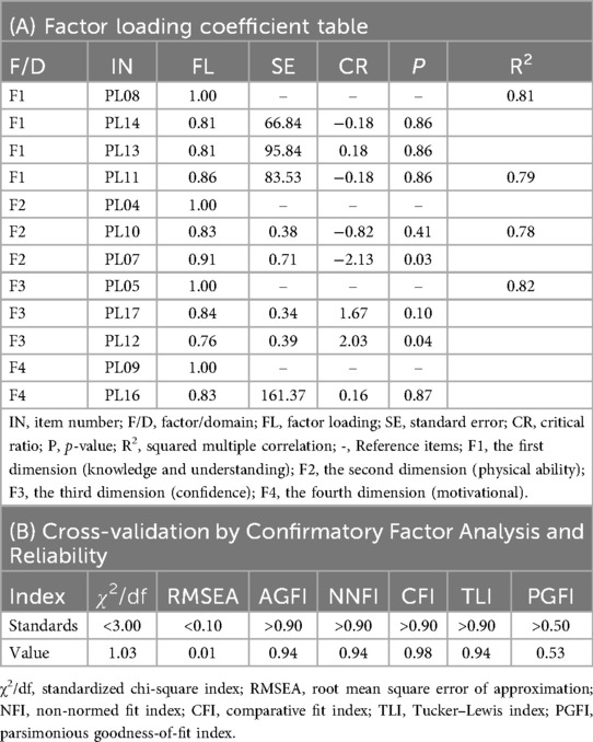Our research builds upon the validation of the PPLI for Hong Kong physical education teachers conducted by the SUM team (32–34). The SUM team identified items 4, 5, and 17 as belonging to the first dimension (knowledge and understanding), items 11, 12, and 13 to the second dimension (self-expression and communication with others), and items 2, 7, and 8 to the third dimension (self-perception and self-confidence) (32–34). The psychological structure characteristics of PL among faculty members (non-physical education teachers) may differ from those of Hong Kong PE teachers. This serves as the theoretical basis for conducting CFA calculations of the PPLI in our study (through cross-cultural research methods), specifically for assessing conceptual redundancy and correlation comparisons.
