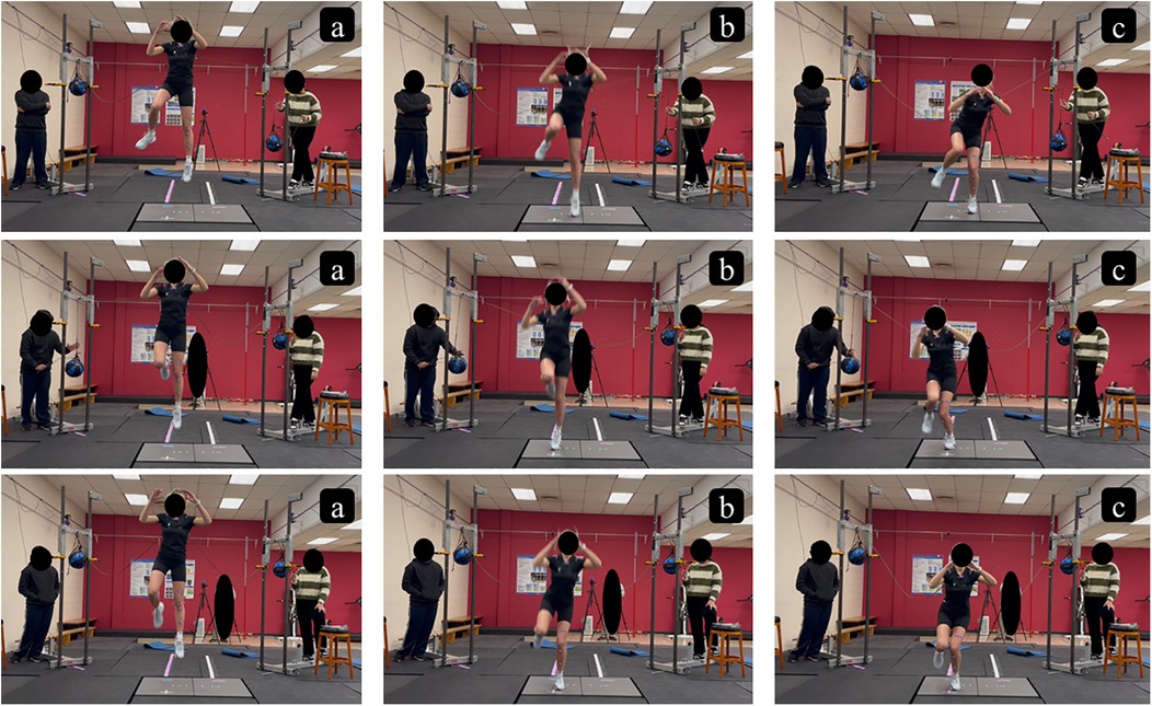 Figure 1. Double-leg jump and single-leg landing at peak jump height (a), initial ground contact (b), and landing (c) with posterior-lateral pulling perturbation (top row), posterior-medial pulling perturbation (middle row), and no perturbation (bottom row) applied to the upper trunk.