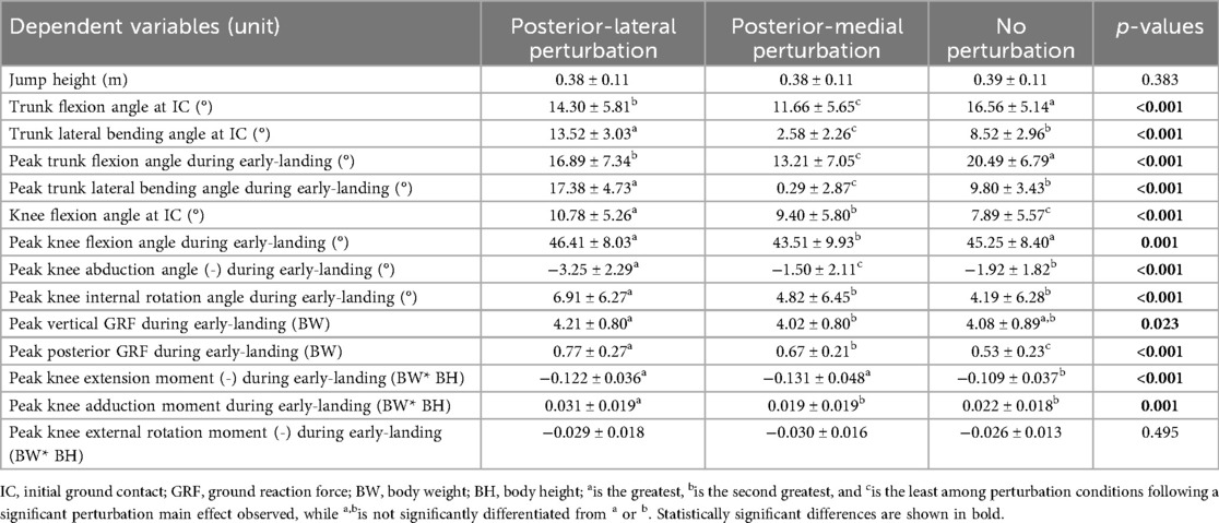 Results: No significant differences were observed in perturbation duration, timing, and jump height (p ≥ 0.276). Posterior-lateral perturbation demonstrated the greatest trunk lateral bending angles, knee flexion angle at initial ground contact (IC), peak knee abduction/internal rotation angles, peak posterior GRF, and peak knee adduction moments during landing compared to other conditions (p ≤ 0.004). Posterior-medial perturbation showed the smallest trunk flexion angles and knee flexion angles among all conditions (p ≤ 0.035), while greater peak posterior GRF and knee extension moments compared to no perturbation (p < 0.001).