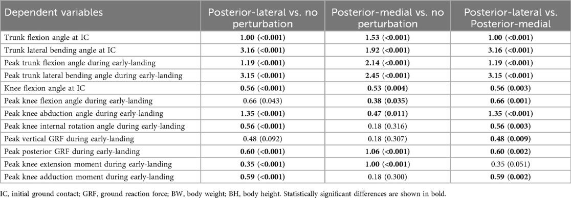 No significant differences were found in perturbation timing (Posterior-lateral: 30.90 ± 29.48 ms; Posterior-medial: 20.53 ± 28.48 ms; p = 0.813), perturbation duration (Posterior-lateral: 200.66 ± 46.53 ms; Posterior-medial: 207.54 ± 50.97 ms; p = 0.276), and perturbation impulse (Posterior-lateral: 8936.7 ± 2072.2 N.ms; Posterior-medial: 9243.2 ± 2270.0 N.ms; p = 0.276). Significant perturbation main effects were observed in all dependent variables except jump height and peak knee external rotation moment during early-landing (Table 1). Overall, 41 pairwise comparisons were conducted, and the largest p-value was 0.035 following the Benjamini–Hochberg procedure. Effect sizes with corresponding p-values for each comparison are shown in Table 2.