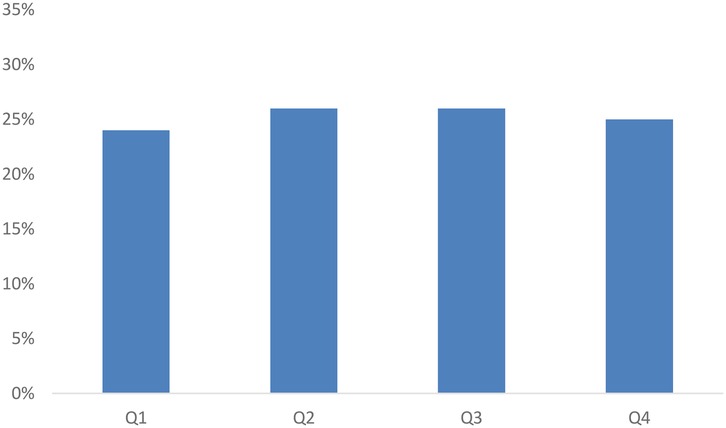 A significant majority of the 15,734 players played first person shooter games (10,361), with multiplayer online battle arena games (3,691), real-time strategy games (561) and traditional sports games (571) making up a total of 4,823 players (the remaining 550 played more than one game. As can be seen in Figure 1, the distribution of birthdays across quartiles was quite uniform. A chi-square goodness of fit test indicated that there were statistically significant differences between the four quartiles [χ2 (3, N = 15,734) = 24.38, p < .001], however, the effect size was negligible (Cohen's w = .039). A binomial test of proportions indicated that Q1 is <25% (p < .001), Q2 (p = .182) and Q4 (p = .407) are equal to 25% and Q3 is >25% (p < .001).