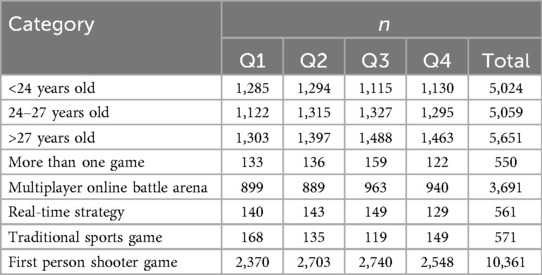 The players were categorized into quartiles depending on their birth month. All players born between January and March were classified into quartile one (Q1), players born between April and June were classified into quartile two (Q2), all players born between July and September were classified into quartile three (Q3), and all players born between October and December were classified into quartile four (Q4). The players’ age was calculated using their birthyear (2024—birthyear), and they were subsequently divided into three approximately equal age categories based on rank-order categorization (<24 years old [Mage = 21.04; SD = 1.71], 24-27 years old [Mage = 25.43; SD = 1.11], and >27 years old [Mage = 32.02; SD = 3.83). The various games included were classified as either real-time strategy games (Star Craft II), first person shooter games (Counter Strike, Valorant, Overwatch, Call of Duty, Apex Legends, and Fortnite), multiplayer online battle arena games (League of Legends and Dota 2), or traditional sports games (FIFA), in accordance with commonly used classifications [see e.g., (1)].