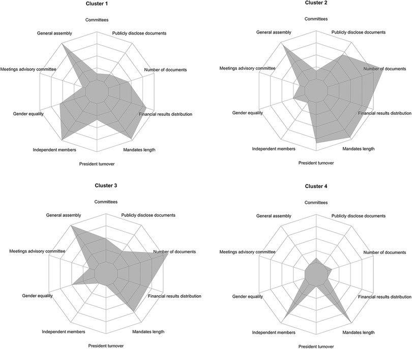 Cluster 1—Balanced governance clubs—shows a relatively balanced governance profile, characterized by high scores in mandate length and gender equality. The number of committees and documents publicly disclosed are moderate, while the presence of independent members and advisory committee meetings is limited compared to other clusters.