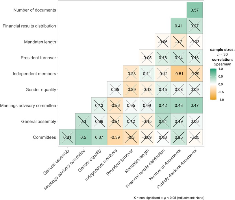 Overall, this correlation matrix highlights several important relationships between governance metrics, particularly in areas related to transparency, leadership turnover, and organizational structure. The strongest associations were observed in metrics involving document disclosure and financial transparency, while other governance aspects, such as gender equality and advisory committee meetings, did not display strong correlations with other variables.