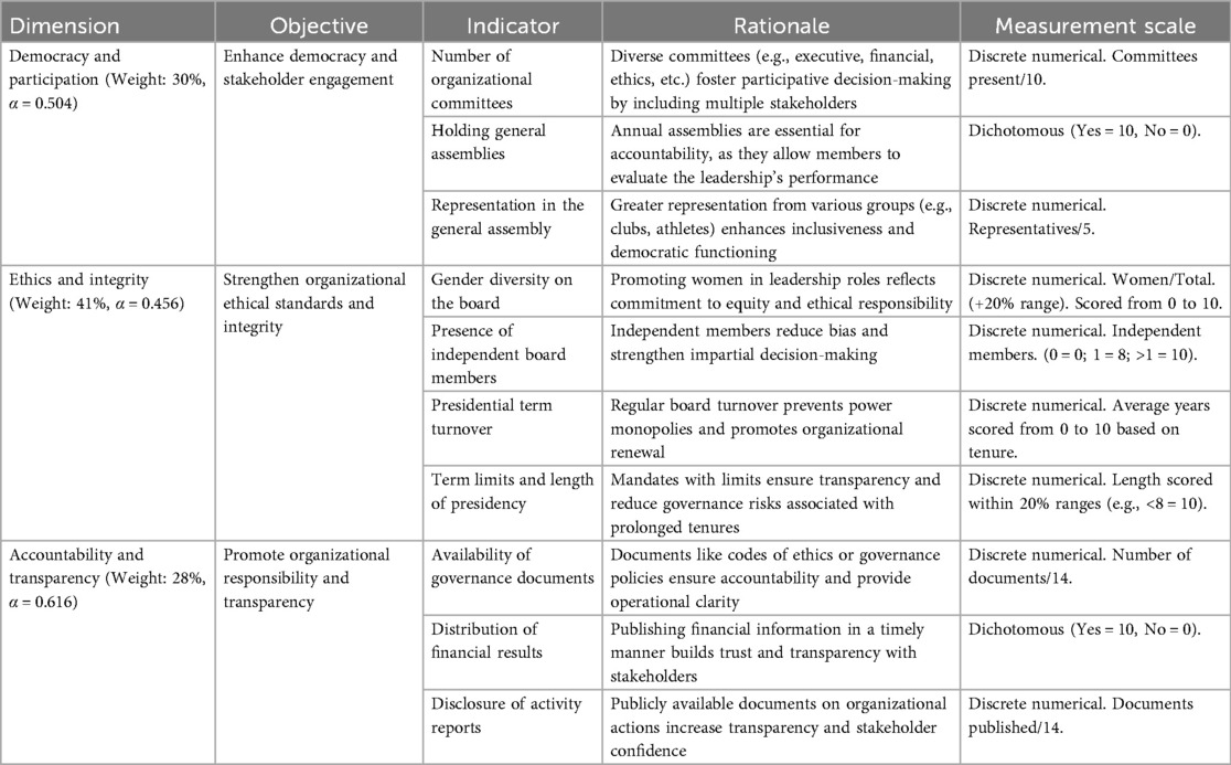 Examining the principles of good governance in sports often highlights the absence of a unified and standardized framework (18). This study focuses on evaluating three critical aspects deemed essential for good governance within sport organizations: democracy and participation, ethical conduct and integrity, as well as transparency and accountability (18, 19). To accomplish this, a bespoke assessment model was designed, drawing methodological insights from previous works on scale development and composite indicators (60–62). The model also builds on approaches applied by Muñoz et al. (63) in their analysis of governance within Catalan Sport Federations. The creation of this framework adhered to a meticulous, phased methodology: