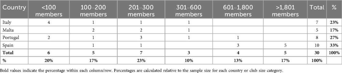 The response rate for participation was 62.5%, yielding a final sample of 30 tennis clubs. These clubs were distributed as follows: Spain (10 clubs), Italy (7 clubs), Portugal (8 clubs), and Malta (5 clubs). Table 2 provides an overview of the final sample, highlighting its representativeness across the predefined membership categories. This diverse and internationally distributed sample enables a meaningful exploration of governance practices in tennis clubs across different territorial and organizational contexts.