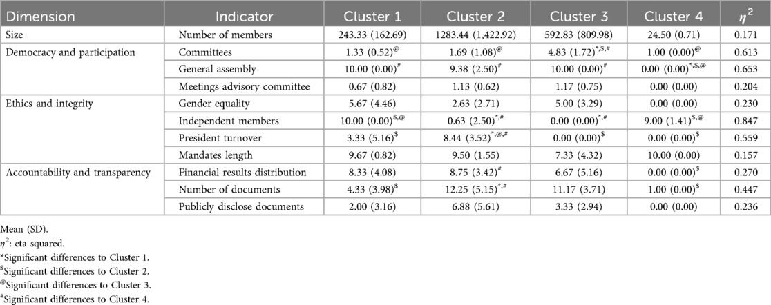 Ethics and integrity metrics, specifically the presence of independent members on the board, varied significantly between clusters (η2 = 0.847). Cluster 4 had the highest average (9.00 ± 1.41), while Clusters 1 and 3 reported no independent members (0.00 ± 0.00). President turnover also showed moderate differences across clusters (η2 = 0.559), with Cluster 2 reporting the highest turnover (8.44 ± 3.52), significantly higher than Clusters 1, 3, and 4. In contrast, no significant differences were observed in the length of mandates, with a small effect size (η2 = 0.157).