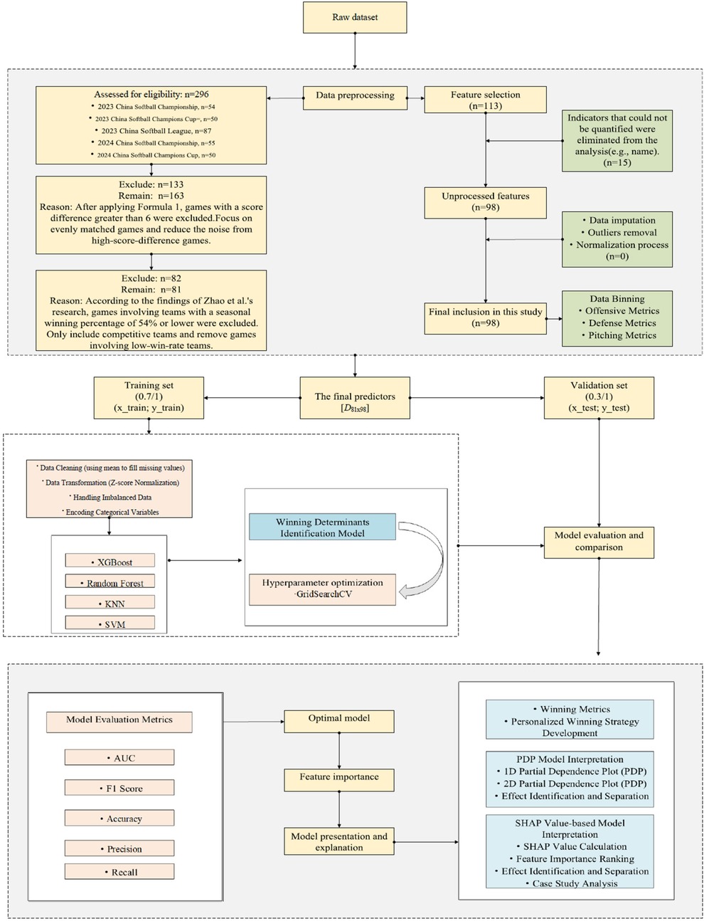 The collected game data first underwent preprocessing steps, including screening and data cleaning, which enabled the construction of the experimental dataset. Subsequently, the dataset was randomly partitioned (without replacement) into training and testing samples. Subsequently, supervised learning was performed separately for the four selected machine learning algorithms using the training and testing sets. Model results obtained from the testing data set were compared and analyzed based on the five evaluation metrics mentioned previously, and the best-performing model was identified. Finally, with the focus on the “win” scenario (target variable = 1), the selected model's predictions were explained, using the SHAP and PDP algorithms, from two perspectives: overall feature contributions and individual feature effects. These methods reveal how high-dimensional input features influence model predictions, along with the direction and magnitude of such influences, providing strategic references for customized in-game tactics for different teams.