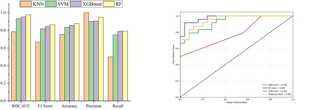 Table 3 presents the evaluation metrics for the four machine-learning models, which are based on the testing dataset described in Section 1.3. Corresponding performance indicators are visualized in Figure 2a, and the ROC curves illustrating the win-loss predictions of each of the four models are presented in Figure 2b. Figure 2a demonstrates that, excluding the KNN model, all the models exhibit strong generalization capabilities on the test dataset. A comprehensive assessment of Table 3 and Figures 2a–b shows that the RF model obtained the highest ROC AUC and F1 scores among the compared models, implying comparatively better predictive performance and generalization within this dataset.