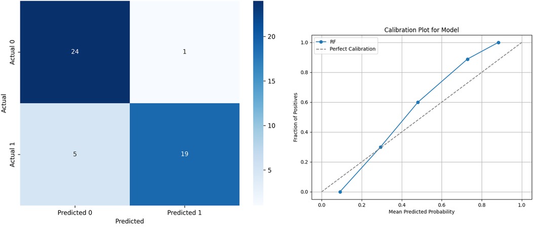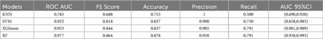 Model performance was comprehensively evaluated using classic metrics from the machine learning domain, including AUC, F1-score, accuracy, precision, and recall. The model with the best performance was selected based on these metrics, while the confusion matrix and calibration were used to illustrate the performance of the selected model.