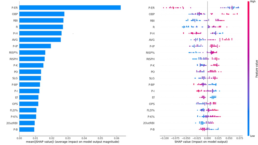 The top ten features ranked by Shapley value through comparative calculations include P-ER, OBP, RBI, R, P-H, AVG, P-IP, RISP%, RISPH, P-K. Figure 4a presents the mean Shapley values for all features, while Figure 4b shows the top 20 features ranked by Shapley value across the dataset. Given the large number (98) of total features, Figure 4b is termed the “Global Feature Importance” plot for convenience. In Figure 4b, each row on the y-axis represents an individual feature, while the x-axis indicates the magnitude of the Shapley values. A larger Shapley value signifies greater contribution to the predictive outcome. Positive Shapley values imply a positive impact on the predicted outcome, whereas negative values indicate the opposite. The color of each dot corresponds to the value of a feature instance, transitioning from blue (low feature values) to red (high feature values). As illustrated in Figure 4b, features such as OBP, RBI, R, AVG, P-IP, RISP%, RISPH, P-K, PO, SLG, OPS, FLD%, P-K%, 2OutRBI have red dots clustered toward the right side of the x-axis, with blue dots clustered toward the left side. This pattern suggests that as the values of these features increase, they positively influence game outcome prediction. Conversely, for features like P-ER, P-H, P-BP, P-I, Ef, P-B, blue dots are clustered toward the right, while red dots are clustered toward the left—lower values for these features negatively impact game outcome prediction (i.e., predicting win or loss).