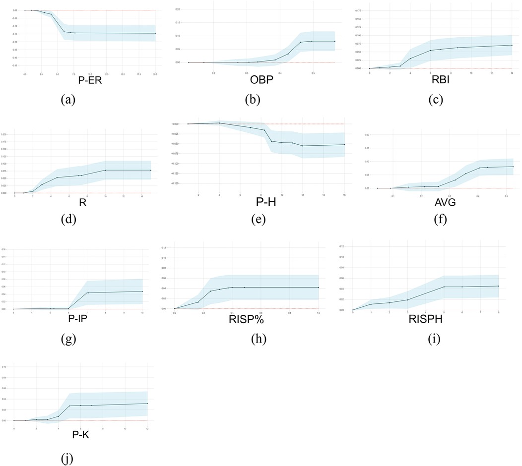 Using the top ten features identified by SHAP analysis in Section 2.3, including P-ER and OBP, we further employed the PDP algorithm to analyze how individual features influenced the predicted game outcomes. For one-dimensional PDP analysis, given the model described in (Equation 4), where x is a feature vector, the PDP effect of feature is calculated according to (Equation 9):