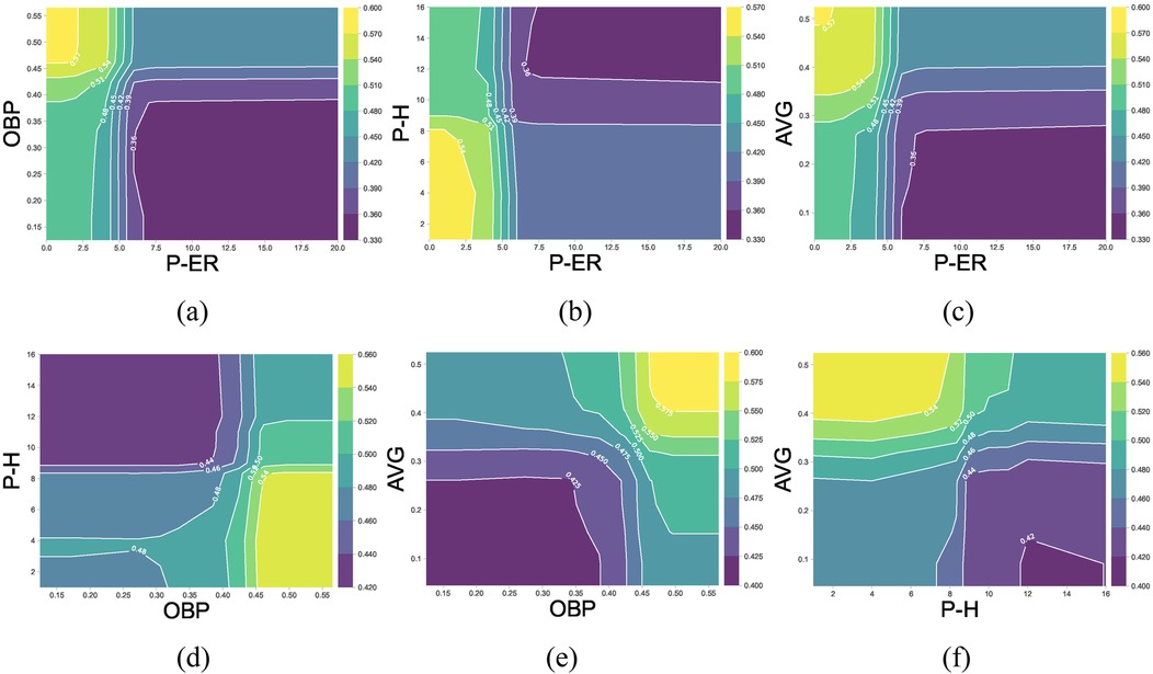 To further examine the interaction effects among important features contributing to game outcomes, this study analyzed the top six features ranked by Shapley value. Since Runs Batted In (RBI) and Runs Scored (R) have direct and dominant effects on game results, this section focuses on the interaction effects of other potential key features. Therefore, the remaining four features—Earned Runs (P-ER), On-Base Percentage (OBP), Hits (P-H), and Batting Average (AVG)—were selected for two-dimensional PDP analysis. The results are illustrated in Figure 6; the X-axis and Y-axis represent the values of the two interacting features, while the Z-axis, visualized through contour shading, represents their combined effect on winning probability. Lighter colors correspond to higher winning probabilities, while darker colors indicate lower winning probabilities. When the Z-axis value exceeds 0.5, the interaction effect of the selected feature pair has a significant positive contribution to the game outcome (i.e., increasing the probability of winning). Figures 6a–f provides an intuitive visualization of how selected feature interactions influence game results, offering quantitative insights into decisive factors for further strategic analysis.