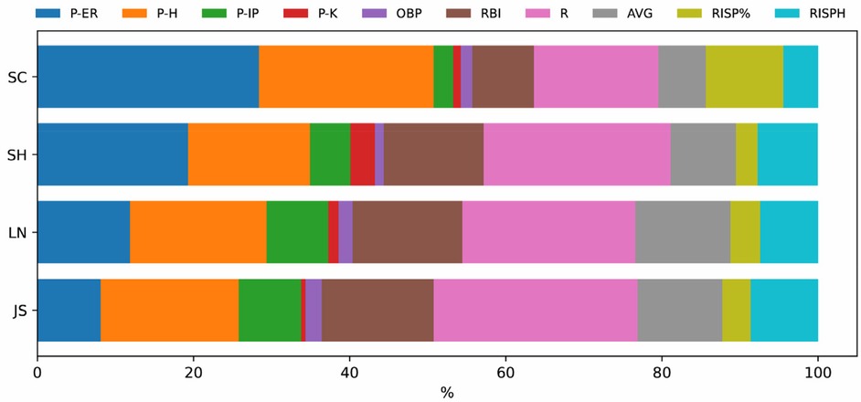 Table 4 and Figure 7 illustrate the contributions of the decisive factors identified by the RF model for the four sample teams (SC, n = 21; SH, n = 16; LN, n = 23; JS, n = 21). The results reveal distinct strategic differences among teams in terms of the relative importance of different factors affecting game outcomes. SC relies heavily on pitching performance, with pitching indicators contributing 54.26% to their overall key factors. The most influential factors for SC are Earned Runs (P-ER) and Hits (P-H)—SC's winning strategy focuses on limiting opponents' scoring and maintaining control over the game through strong pitching performance. The batting totals of teams SH, LN, and JS are more important contributing factors. These three teams place higher emphasis on offensive performance, with offensive indicators contributing 56.76%, 61.38%, and 65.63% to their decisive factors, respectively. In particular, Runs Batted In (RBI) and Batting Average (AVG) stand out as the most significant offensive contributors for these teams. This highlights the importance of scoring ability and batting efficiency in their winning strategies. LN and JS also rely heavily on Batting Average with Runners in Scoring Position (RISP%)—these teams prioritize capitalizing on key offensive opportunities to maximize scoring potential.