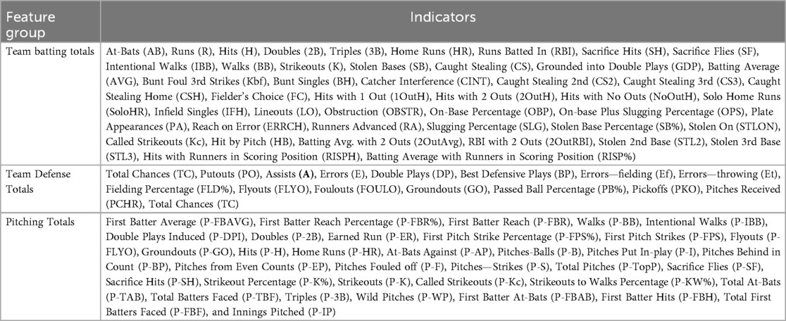 Furthermore, to facilitate subsequent analysis and interpretation of game outcome predictions, the 98 features were categorized into three groups based on the offensive and defensive roles in softball: (1) Team Batting Totals: Indicators reflecting a team's batting performance; (2) Team Defense Totals: Indicators representing overall team defensive performance; (3) Pitching Totals: As pitchers play a distinct and critical role in defense, their statistics are classified separately to evaluate their impact on game outcomes. The features and classification results are detailed in Table 1. Additionally, all statistics collected from the ScorePAD system were recalculated to align with the seven-inning format of softball games. If an extra inning occurred, the actual number of innings was used to ensure the accuracy of the final statistics. The final dataset comprised 81 game samples, each represented by a 98-dimensional feature vector, denoted as .