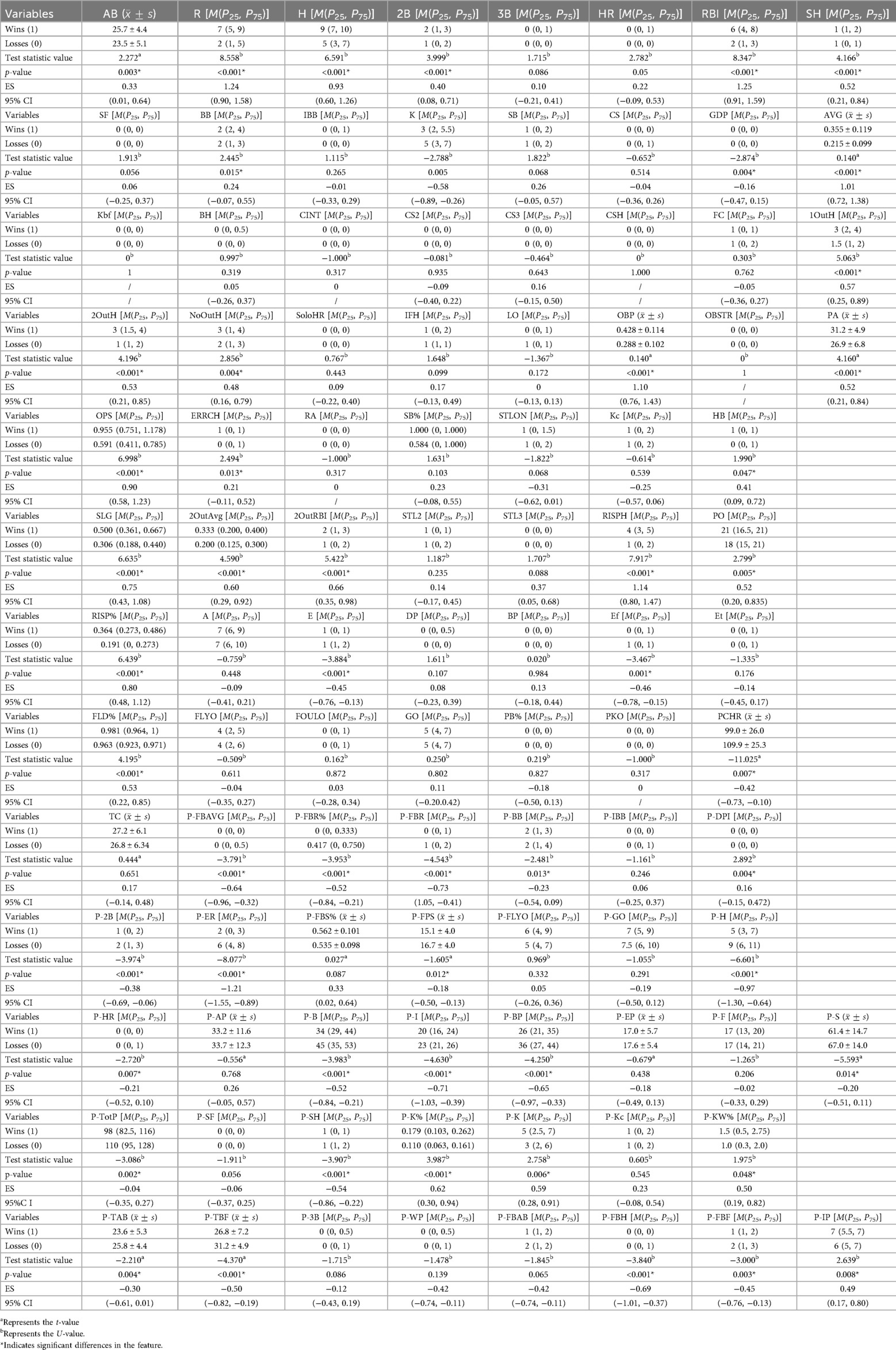 As shown in Table 2 and Figure 4, the top ten features (i.e., factors) ranked by Shapley value exhibit statistically significant differences between winning and losing teams (p < 0.05, Table 2) and have a positive impacts on the outcome variable. The winning teams generally have higher mean or median values for positive key indicators compared to the losing teams, and vice versa. To further examine pitching and batting indicators, we analyze the impact of five key metrics in pitching (P-ER and P-H) and batting (OBP, AVG and SLG)). Among pitching indicators, Pitcher's Earned Runs (P-ER) was identified as the most influential winning factor in this study. This finding aligns with previous NCAA Division I softball analytics, where P-ER is widely used as a core metric for evaluating pitcher performance (22). P-ER represents runs allowed directly because of pitching performance, such as runs scored after a walk or hits leading to runners advancing. A low P-ER indicates that the pitcher effectively suppresses opposing batters, making it difficult for them to make solid contact. Teams with lower P-ER typically have stronger pitching performance. Pitcher's Hits Allowed (P-H) is a key factor contributing to P-ER. Figures 6d,f indicate that when a pitcher allows a certain number of hits, the team's offensive ability (AVG > 30% or OBP > 40%) must compensate for the defensive shortcomings to maintain a chance of winning. The data from this study indicate that when P-H exceeds 11, the team's probability of winning decreases significantly. Figure 6b shows that P-ER and P-H exhibit a strong negative interaction effect with offensive metrics, suggesting that pitching performance is crucial in determining the outcome of a game. Among batting indicators, On-Base Percentage (OBP) and Batting Average (AVG) ranked 2nd and 5th, respectively, in terms of winning impact. Hakes et al. (18) found that OBP and Slugging Percentage (SLG) are key differentiators of winning probability in Major League Baseball (MLB), as they are highly correlated with Runs (R). This study further reveals that OBP contributes approximately twice as much to winning probability as SLG. Interestingly, AVG ranks higher than SLG in terms of Shapley values—AVG has a greater impact on winning in softball when compared to SLG. This difference can be attributed to variations between baseball and softball in terms of game dynamics, including field dimensions and tactical priorities. Smaller softball fields result in less time for outfielders to react, restricting base advancement on extra-base hits and making multi-base hits less common. Softball strategies emphasize short-ball tactics, focusing on bunting and aggressive baserunning to create scoring opportunities. Shorter base paths (18.3 m in softball) encourage a single-hit, station-to-station offensive approach to generate runs. These factors explain why Batting Average (AVG) has a more significant impact on winning probability in softball than Slugging Percentage (SLG). Moreover, Runs Batted In (RBI), Hits with Runners in Scoring Position (RISPH), and Batting Average with Runners in Scoring Position (RISP%) ranked 3rd, 8th, and 9th, respectively, in terms of winning impact. These offensive statistics are more directly related to scoring than OBP and AVG. RBI serves as a crucial measure of a player's contribution to team scoring. A high RBI value indicates that a batter successfully capitalizes on scoring opportunities, increasing team offensive efficiency. RISPH and RISP% measure a team's ability to convert scoring opportunities into runs. Higher RISPH and RISP% values indicate that the team efficiently capitalizes on scoring opportunities by driving runners home when possible. This significantly boosts winning probability.