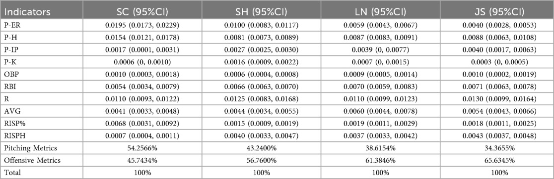 In summary, SC, SH, LN, and JS exhibit distinct dependencies on pitching and offensive performance. However, regardless of the primary winning strategy, RBI and AVG consistently emerge as critical factors across all teams. This finding reinforces that scoring ability and stable batting performance remain core determinants of victory, regardless of whether a team prioritizes offense or pitching. Cairney (20) found that in MLB, the contribution ratio of offensive and defensive abilities to winning probability is approximately 1:1. Similarly, this study suggests that a balanced approach between offense and defense is crucial for overall team performance and resilience. JS and LN, as traditional domestic powerhouses, dominate offensively in national competitions. Nevertheless, against teams with no significant weaknesses in either pitching or offense, such as the USA and Japan, their reliance on offense may not be sufficient. When facing such elite opponents, dominant pitching performances can neutralize strong offenses, making it difficult for JS and LN to generate runs. Hence, this study recommends that the Chinese women's softball teams also focus on strengthening their pitching depth.