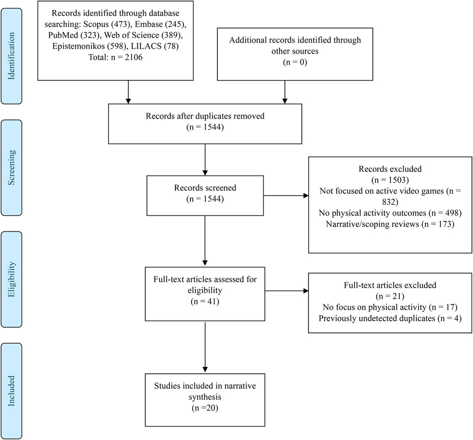 Flowchart depicting a systematic review process. Initially, 2,106 records are identified from databases, with no additional sources. After removing duplicates, 1,544 records are screened. Of these, 1,503 are excluded for reasons like not focusing on active video games. Forty-one full-text articles are assessed, with 21 excluded due to lack of physical activity focus or duplicates. Finally, 20 studies are included in the narrative synthesis.