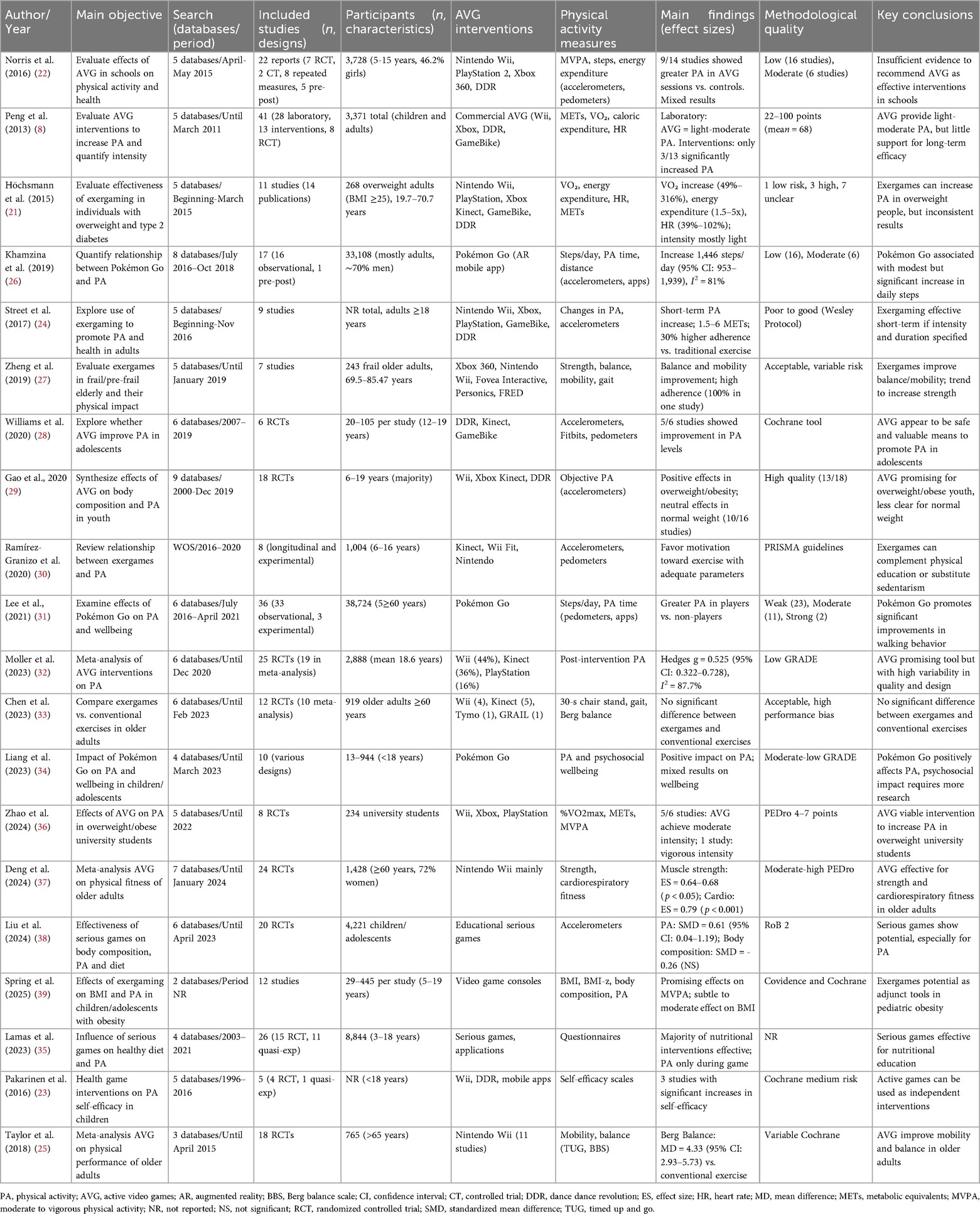 Four reviews focused specifically on older adults, represented by the works of Taylor et al. (25), Zheng et al. (27), Chen et al. (33), Deng et al. (37). This substantial interest in geriatric population reflects the recognition of AVG potential to overcome traditional barriers to exercise in older adults, such as mobility problems, fear of falls, and social isolation. Two reviews (10%) focused on adults with specific health conditions: Höchsmann et al. (21) in adults with overweight and type 2 diabetes, and Zhao et al. (36) in university students with overweight or obesity. The remaining four reviews adopted a more inclusive approach, encompassing multiple age groups in their analyses.