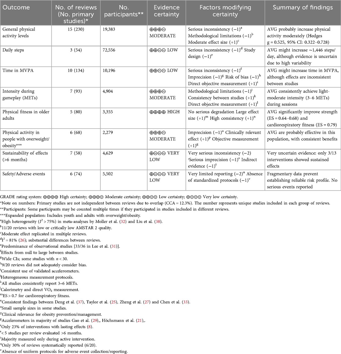 Results: Twenty systematic reviews were included encompassing 418 unique primary studies with >180,000 participants. The most studied platforms were Nintendo Wii (16 reviews), Xbox Kinect (11 reviews), Dance Dance Revolution (8 reviews) and Pokémon Go (3 reviews). AVG consistently achieved light-moderate intensity (3–6 metabolic equivalents or METs) during gameplay. The overall effect was moderate (Hedges g = 0.525, 95%CI: 0.322–0.728) but with high heterogeneity (I2 > 75%). Older adults showed the most consistent benefits [effect size (ES) = 0.64–0.68 muscle strength; ES = 0.79 cardiorespiratory fitness] with high certainty. Only 23% of interventions showed sustained post-intervention effects. Methodological heterogeneity was extreme: different metrics such as METs, moderate-vigorous physical activity (MVPA), steps/day; instruments (accelerometers, calorimetry, questionnaires) and protocols (single sessions to 48 weeks). Only 30% of reviews systematically reported adverse events.