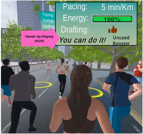 A Heads-Up Display (HUD) (see Figure 1) was integrated into all competition scenes, serving as a central interface that provided participants with immediate performance indicators and status updates. The HUD showed the pacing level, which indicated participants' pacing within the virtual environment, and the energy level which reflected their remaining energy reserves. It also included the booster status, which, when activated, elevated participants' pacing to a maximum of 2:30 min/km for a unique duration of 30 s. After activation, pacing sharply declined with no opportunity for recovery during the ongoing session. The drafting formation status (only in competition scenes 2 and 3) represented the effectiveness of participants' drafting formation. The self-talk feature offered individual affirmations to remember or internalize during specific scenarios and was available in all competition scenes.