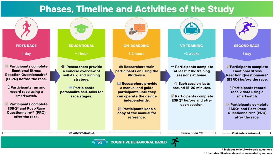 Phases, timeline, and activities of a study in five phases: First Race (1 day) involves completing an Emotional Stress Reaction Questionnaire (ESRQ), running a real-world race, and recording data. Educational phase (1 hour) provides self-talk and running strategy overview. On-boarding (1-2 hours) includes VR device training and manual provision. VR Training (∼3 weeks) requires at least 9 sessions at home, sessions last 15-20 minutes with ESRQ completion. Second Race (1 day) repeats first race activities with data recording and questionnaire completion post-race. The study is cognitive behavioral based, with pre-intervention, intervention and post-intervention stages.