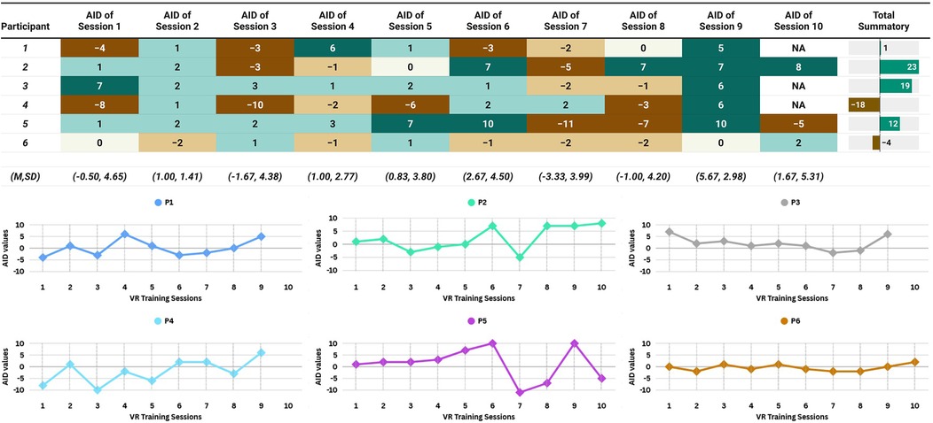 Overall, these findings should be interpreted as exploratory and iterative and must be considered cautiously. They provide a preliminary foundation for refining VR training tools, with future research needed to disentangle VR's specific effects from other training variables, validate the tentative “four-session benchmark” observed here, and investigate adaptive protocols for individualized skill development. Future studies could also explore VR simulations that replicate late-race fatigue, adverse weather conditions by incorporating technologies such as haptic vests, gloves, or thermoregulation systems. Virtual scenarios could also be dynamically adapted to athletes' performance and include unforeseen challenges, such faster opponents, poor self-assessment of pacing or early-race injury, to better train coping strategies under pressure. Additionally, future research should incorporate usability metrics, such as the Assessing Determinants of Prospective Uptake of Virtual Reality Instrument (56), during data collection to better evaluate the multiple factors influencing the adoption of CB-based VR interventions.