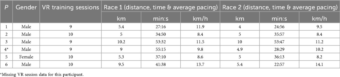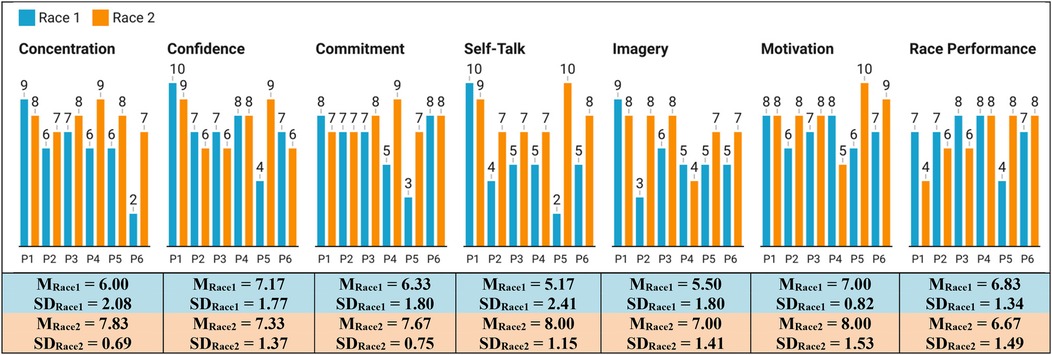 Accordingly, our psychological assessment focused on three areas: (1) emotional reactivity, measuring potential stress responses to VR training; (2) changes in core mental toughness attributes, concentration (sustained focus during challenges), confidence (beliefs in one's abilities), and commitment (resilience to adversity) (31), to explore VR training potential contributions in these attributes; and (3) subjective race perceptions of the motivation, physical state and performance achievement, offering deeper insight into participants’ experiences.