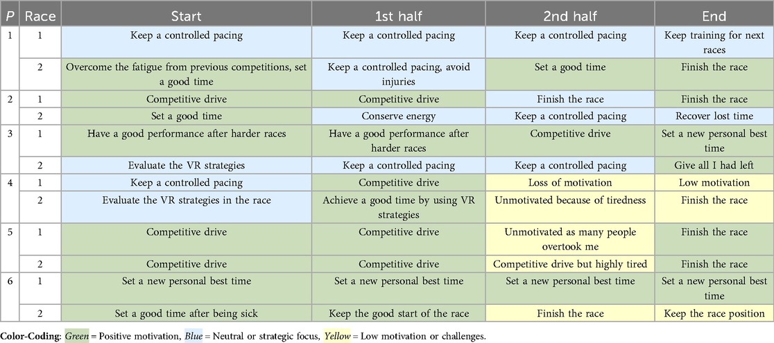 Discussion: These exploratory findings suggest that CB-based VR mental training might help the adoption of certain race strategies and encourage self-talk use withing a coaching context. Results from the study may serve as preliminary reference points for future research aimed at integrating VR tools into complementary coaching approaches.