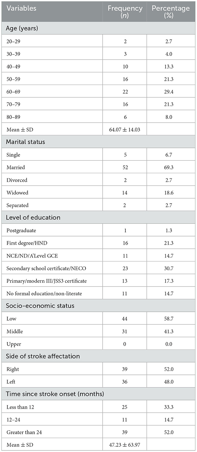 Seventy-five out of the 78 copies of the questionnaires administered to participants were properly completed and analyzed, giving a response rate of 96.2%. Participants were aged 64.07 ± 14.03 years, with a mean time since stroke onset of 47.23 ± 63.97months. More than half (58.7%) were in the lower socio-economic stratum. The mean community reintegration, existential concerns and psychological depression scores were 12.24 ± 2.95, 9.77 ± 5.52, and 13.84 ± 4.71, respectively. The socio-demographic and clinical characteristics of the participants are as summarized in Table 1.