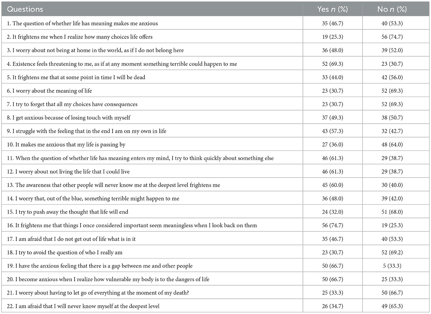 Table 2. Existential concerns, community integration and psychological depression among participants (n = 75).