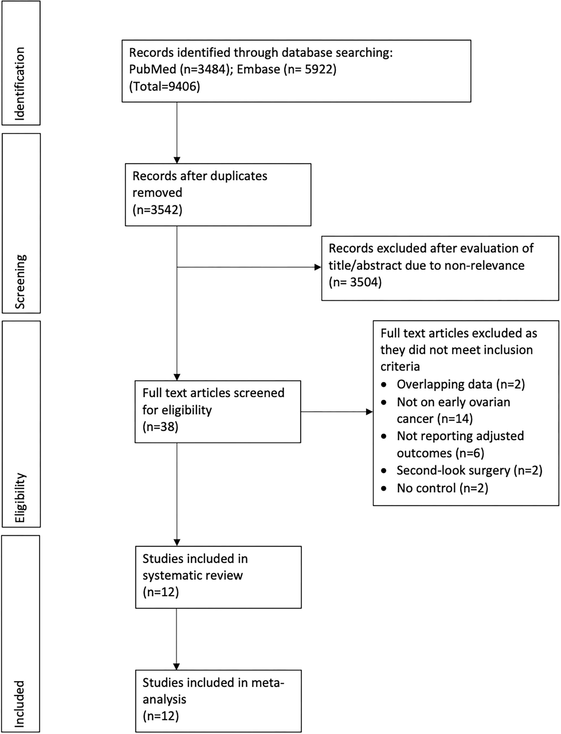 Exclusion criteria were as follows: (1) Studies assessing outcomes of advanced ovarian cancer. (2) Studies on a mixed population of ovarian cancer and not reporting separate data for ESOC. (3) Studies with a total sample size of ≤20 patients. (4) Studies not reporting relevant data. (5) Non-comparative studies and review articles.