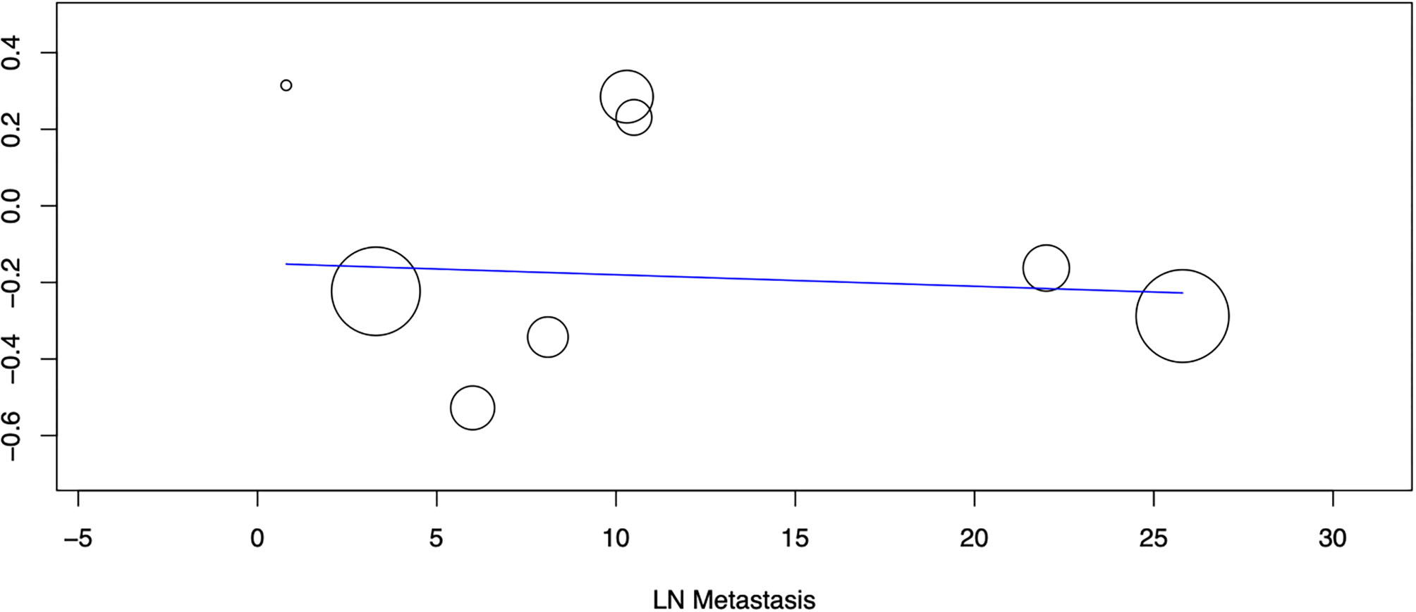 Meta-regression of the influence of percentage of lymph node metastasis (X-axis) on the pooled effect size of OS (Y-axis). Individual studies are represented by circles.
