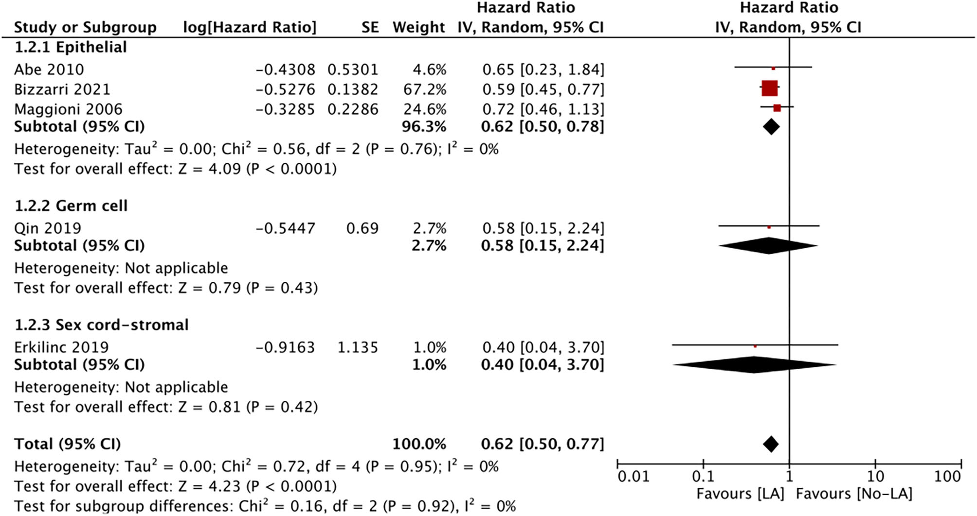 Only five studies reported data on DFS. Meta-analysis of all studies irrespective of the histological type of ESOC indicated that lymphadenectomy is associated with significantly improved DFS as compared to no lymphadenectomy (HR 0.62 95% CI 0.50, 0.77 I2 = 0% p < 0.0001) (Figure 4). Data on epithelial tumors was reported by three studies and subgroup analysis indicated significantly improved DFS with lymphadenectomy (HR 0.62 95% CI 0.50, 0.78 I2 = 0% p < 0.0001). Single studies on malignant germ cell (HR 0.58 95% CI 0.15, 2.24 p = 0.43)and sex cord-stromal tumors (HR 0.40 95% CI 0.04, 3.70 p = 0.42) failed to demonstrate any significant beneficial effect of lymphadenectomy on DFS (Figure 4).